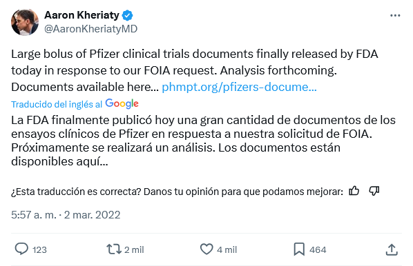 La información va saliendo a la luz a medida que la FDA va entregando bloques de documentos. Desde la organización que ha presentado la denuncia se ha creado esta página web (copia), (copia), para que todo el mundo pueda acceder en abierto a los documentos.