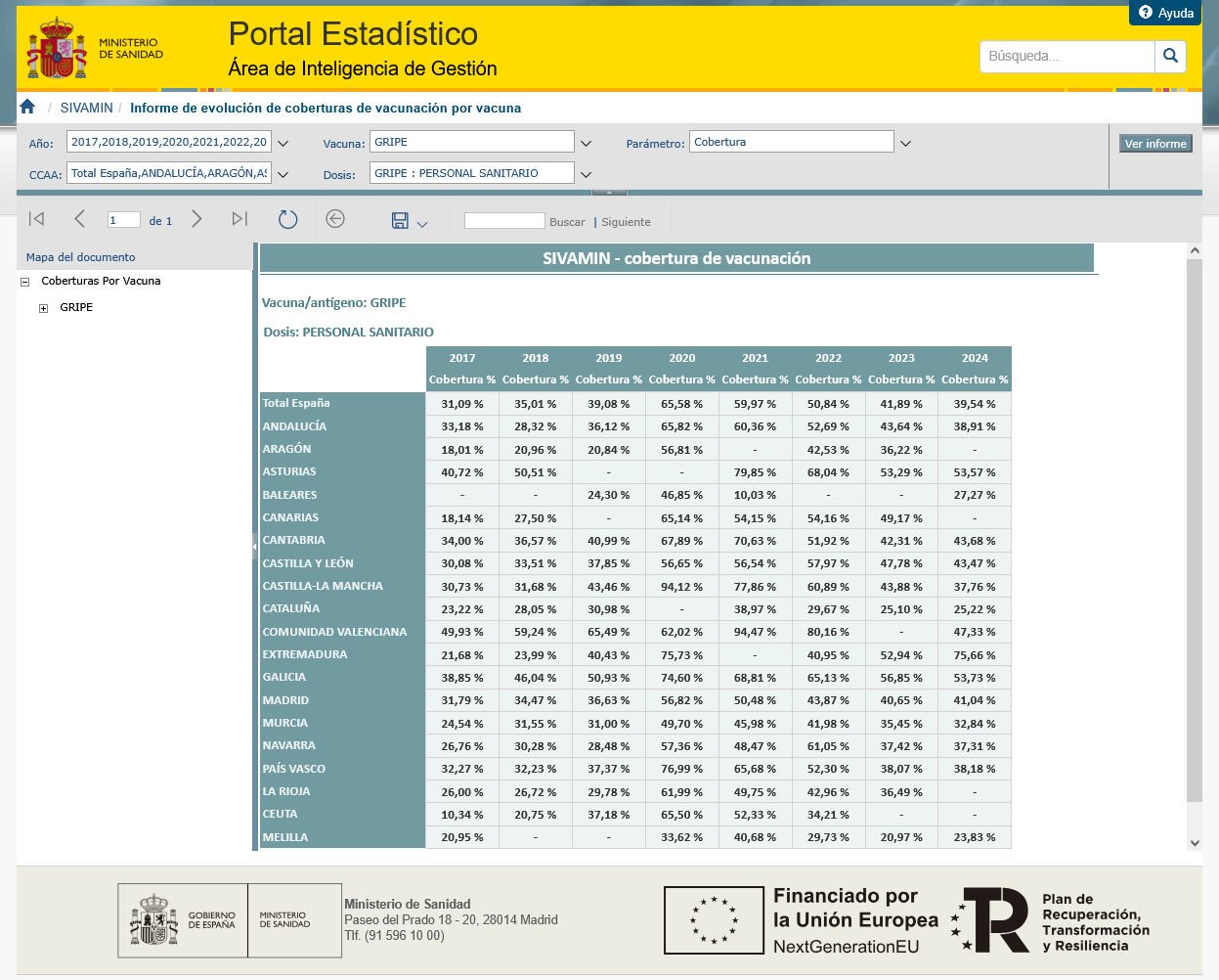 A continuación les dejo los datos del mismo Informe de evolucion de coberturas de vacunacion por vacuna, del Ministerio de Sanidad del Gobierno de España. El parámetro ‘cobertura’ recoje el porcentaje de vacunados, según este informe, donde por ejemplo el 75% del personal sanitario en Cataluña no se vacunó contra la gripe en 2024. En Baleres fueron el 73% y en Melilla el 76% los que tampoco lo hicieron. Les dejo la tabla del Ministerio de Sanidad de las campañas de 2017 a 2024.